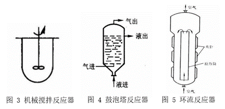 对于细胞反应,反应器中存在可认为是呈固态的细胞、液体和通人的气体,故常用的通气式机械搅拌反应器、进行气-液两相接触的鼓泡塔反应器和环流反应器均为气液-固三相反应器。对于反应物系仅为液体和游离酶组成的酶反应其反应器即为均相反应器。